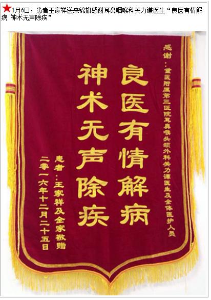 患者王家祥送来锦旗感谢耳鼻咽喉科关力谦医生