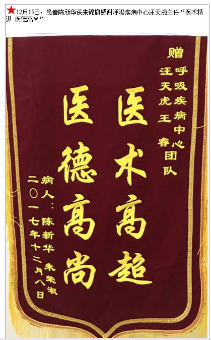 患者陈新华送来锦旗感谢呼吸疾病中心汪天虎主任