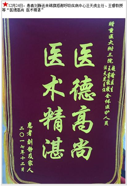 患者刘静送来锦旗感谢呼吸疾病中心汪天虎主任、王睿教授-锦旗-患者心声-患者服务-重庆医科大学附属第三医院【官方网站】