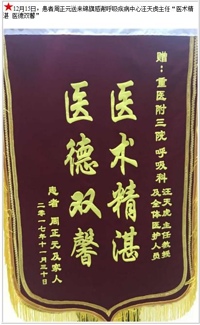 患者周正元送来锦旗感谢呼吸疾病中心汪天虎主任-锦旗-患者心声-患者服务-重庆医科大学附属第三医院【官方网站】