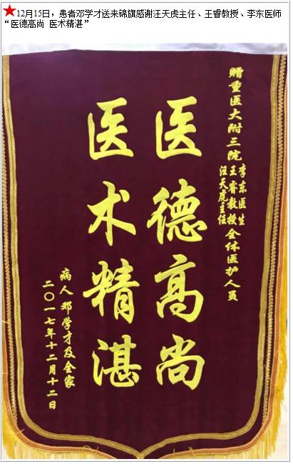 患者邓学才送来锦旗感谢汪天虎主任、王睿教授、李东医师-锦旗-患者心声-患者服务-重庆医科大学附属第三医院【官方网站】