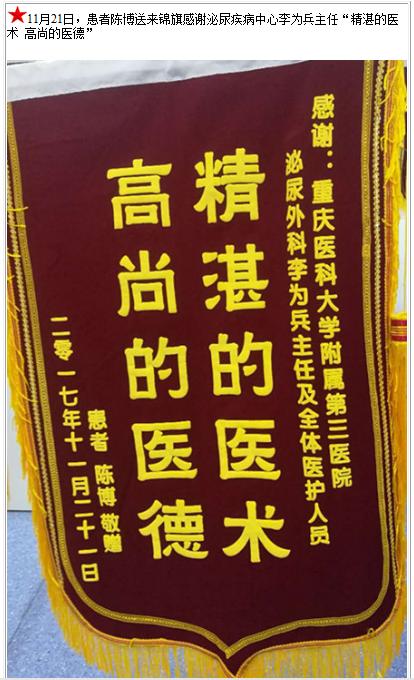 患者陈博送来锦旗感谢泌尿疾病中心李为兵主任-锦旗-患者心声-患者服务-重庆医科大学附属第三医院【官方网站】