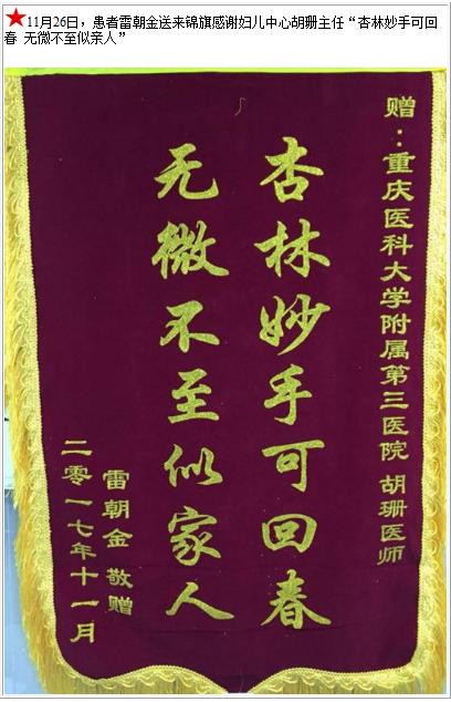 患者雷朝金送来锦旗感谢妇儿中心胡珊主任-锦旗-患者心声-患者服务-重庆医科大学附属第三医院【官方网站】