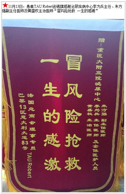 患者TAU Robert送锦旗感谢泌尿疾病中心李为兵主任、朱方强副主任医师及黄盛权主治医师-锦旗-患者心声-患者服务-重庆医科大学附属第三医院【官方网站】