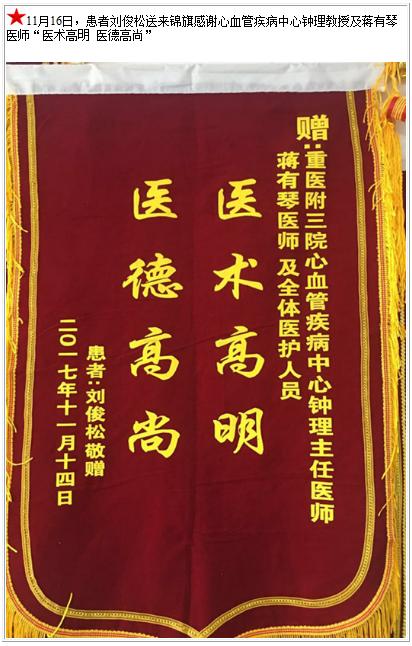 患者刘俊松送来锦旗感谢心血管疾病中心钟理教授及蒋有琴医师-锦旗-患者心声-患者服务-重庆医科大学附属第三医院【官方网站】