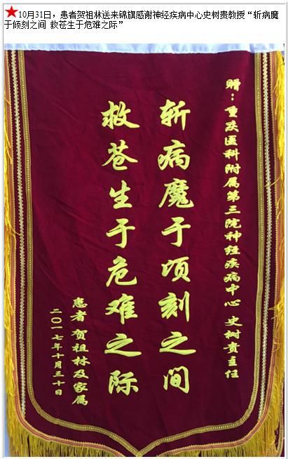 患者贺祖林送来锦旗感谢神经疾病中心史树贵教授-锦旗-患者心声-患者服务-重庆医科大学附属第三医院【官方网站】