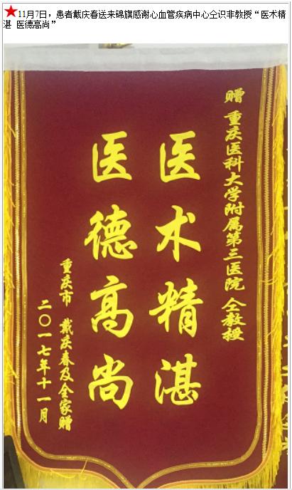 患者戴庆春送来锦旗感谢心血管疾病中心仝识非教授-锦旗-患者心声-患者服务-重庆医科大学附属第三医院【官方网站】