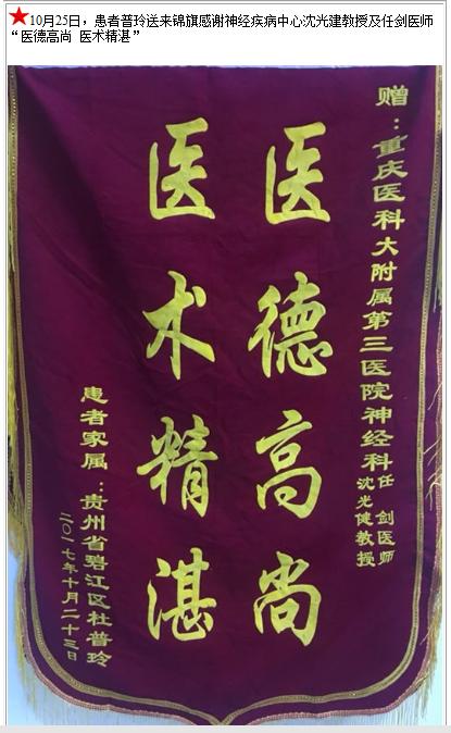患者普玲送来锦旗感谢神经疾病中心沈光建教授及任剑医师-锦旗-患者心声-患者服务-重庆医科大学附属第三医院【官方网站】