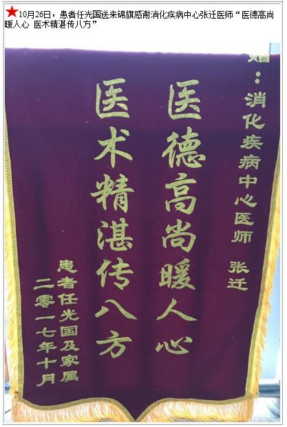 患者任光国送来锦旗感谢消化疾病中心张迁医师