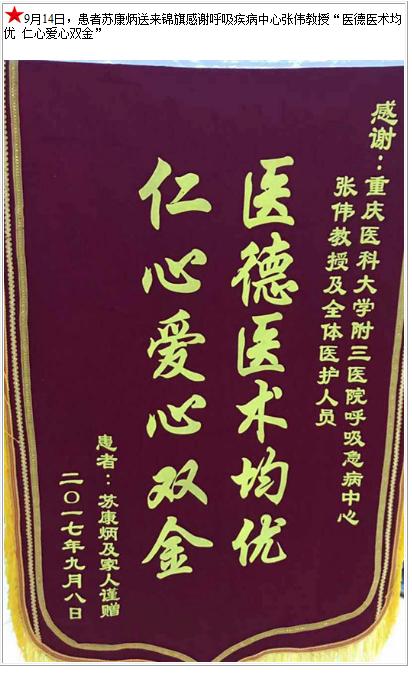 患者苏康炳送来锦旗感谢呼吸疾病中心张伟教授-锦旗-患者心声-患者服务-重庆医科大学附属第三医院【官方网站】