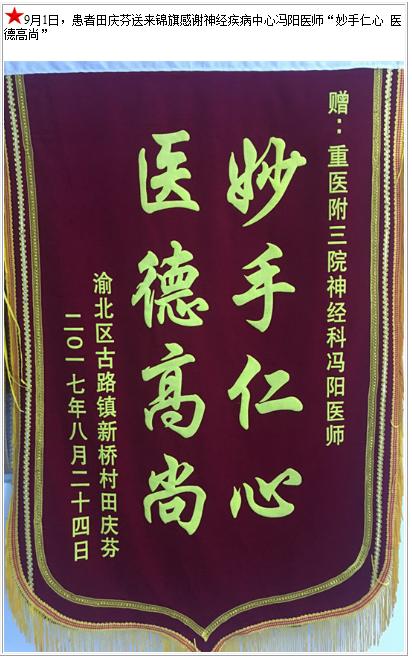 患者田庆芬送来锦旗感谢神经疾病中心冯阳医师-锦旗-患者心声-患者服务-重庆医科大学附属第三医院【官方网站】
