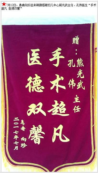 患者向珍送来锦旗感谢妇儿中心熊光武主任、孔伟医生