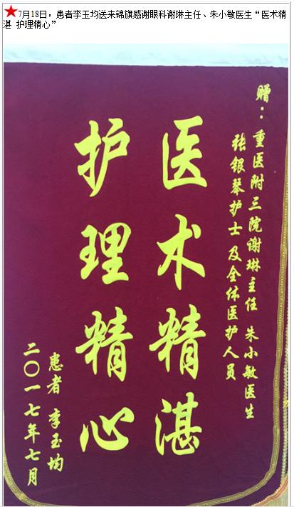 患者李玉均送来锦旗感谢眼科谢琳主任、朱小敏医生-锦旗-患者心声-患者服务-重庆医科大学附属第三医院【官方网站】