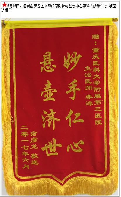 患者俞彦龙送来锦旗感谢骨与创伤中心李洋-锦旗-患者心声-患者服务-重庆医科大学附属第三医院【官方网站】
