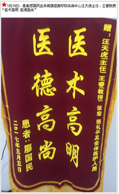 患者廖国民送来锦旗感谢呼吸疾病中心汪天虎主任、王睿教授