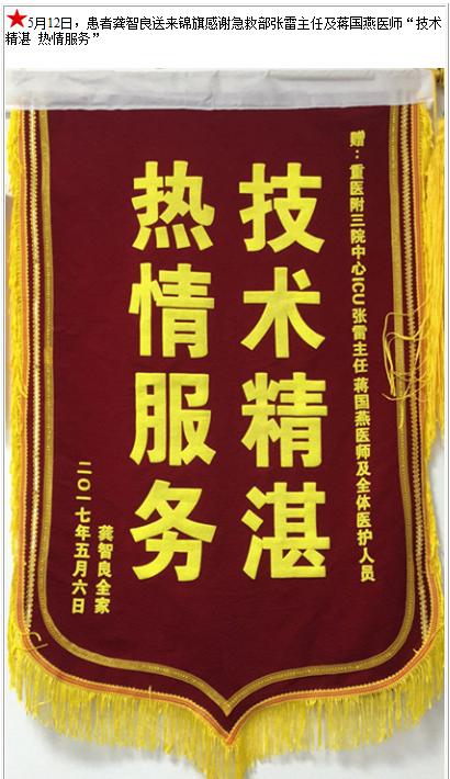 患者龚智良送来锦旗感谢急救部张雷主任及蒋国燕医师-锦旗-患者心声-患者服务-重庆医科大学附属第三医院【官方网站】