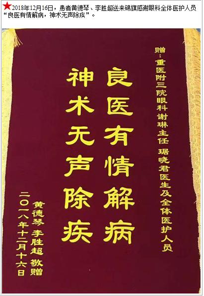 患者黄德琴、李胜超送来锦旗感谢眼科全体医护人员。-锦旗-患者心声-患者服务-重庆医科大学附属第三医院【官方网站】