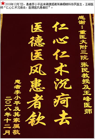 患者李小平送来锦旗感谢耳鼻咽喉科张民医生、王峰医师-锦旗-患者心声-患者服务-重庆医科大学附属第三医院【官方网站】