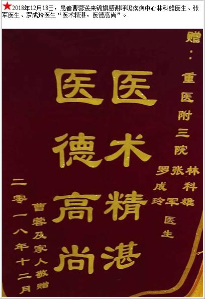 患者曹蓉送来锦旗感谢呼吸疾病中心林科雄医生、张军医生、罗成玲医生-锦旗-患者心声-患者服务-重庆医科大学附属第三医院【官方网站】