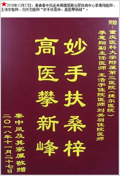患者秦中凤送来锦旗感谢泌尿疾病中心季惠翔医师、王浩宇医师、刘关羽医师-锦旗-患者心声-患者服务-重庆医科大学附属第三医院【官方网站】