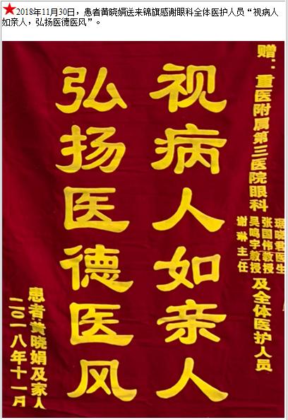 患者黄晓娟送来锦旗感谢眼科全体医护人员-锦旗-患者心声-患者服务-重庆医科大学附属第三医院【官方网站】