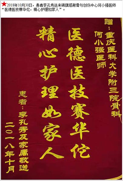 患者李孔秀送来锦旗感谢骨与创伤中心何小强医师-锦旗-患者心声-患者服务-重庆医科大学附属第三医院【官方网站】