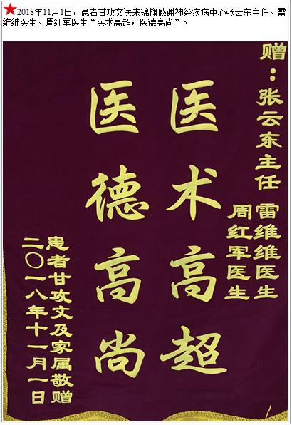 患者甘攻文送来锦旗感谢神经疾病中心张云东主任、雷维维医生、周红军医生