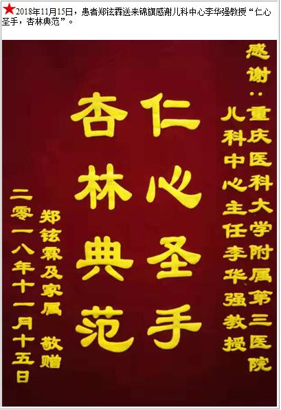 患者郑铉霖送来锦旗感谢儿科中心李华强教授-锦旗-患者心声-患者服务-重庆医科大学附属第三医院【官方网站】
