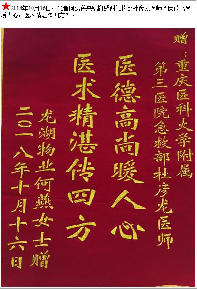 患者何燕送来锦旗感谢急救部杜彦龙医师-锦旗-患者心声-患者服务-重庆医科大学附属第三医院【官方网站】