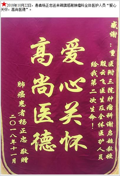 患者杨正忠送来锦旗感谢肿瘤科全体医护人员-锦旗-患者心声-患者服务-重庆医科大学附属第三医院【官方网站】