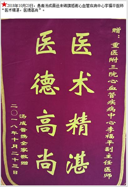 患者汤成晋送来锦旗感谢心血管疾病中心李福平医师-锦旗-患者心声-患者服务-重庆医科大学附属第三医院【官方网站】