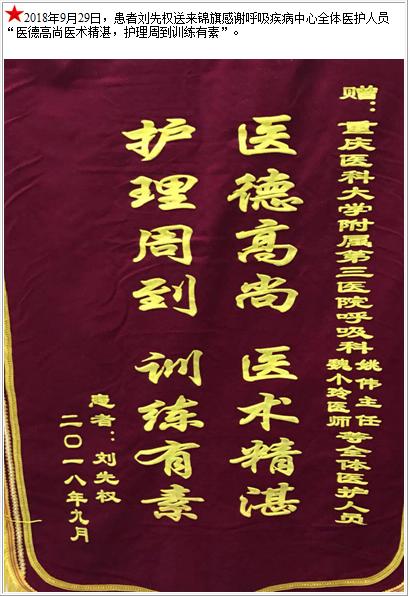 患者刘先权送来锦旗感谢呼吸疾病中心全体医护人员-锦旗-患者心声-患者服务-重庆医科大学附属第三医院【官方网站】