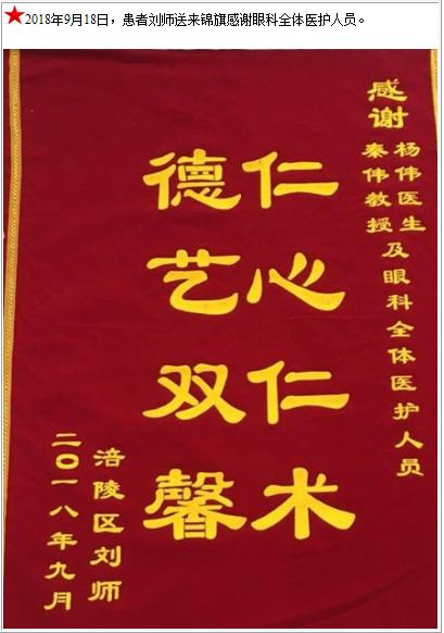 患者刘师送来锦旗感谢眼科全体医护人员