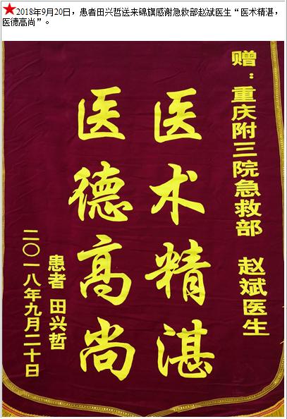 患者田兴哲送来锦旗感谢急救部赵斌医生-锦旗-患者心声-患者服务-重庆医科大学附属第三医院【官方网站】
