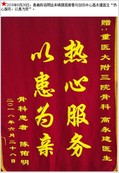患者陈佑明送来锦旗感谢骨与创伤中心高永建医生-锦旗-患者心声-患者服务-重庆医科大学附属第三医院【官方网站】