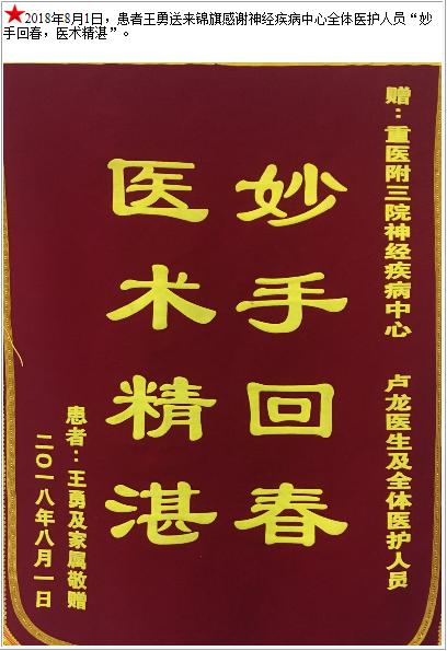 患者王勇送来锦旗感谢神经疾病中心全体医护人员-锦旗-患者心声-患者服务-重庆医科大学附属第三医院【官方网站】