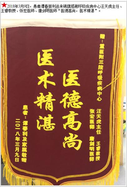 患者谭春丽利送来锦旗感谢呼吸疾病中心汪天虎主任、王睿教授、张宏医师、唐剑明医师-锦旗-患者心声-患者服务-重庆医科大学附属第三医院【官方网站】