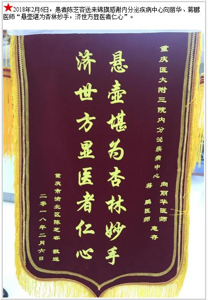 患者陈芝容送来锦旗感谢内分泌疾病中心向丽华、蒋鹏医师-锦旗-患者心声-患者服务-重庆医科大学附属第三医院【官方网站】