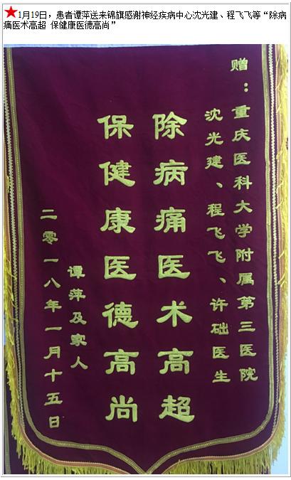 患者谭萍送来锦旗感谢神经疾病中心沈光建、程飞飞等-锦旗-患者心声-患者服务-重庆医科大学附属第三医院【官方网站】
