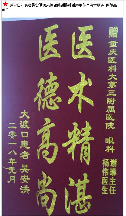 患者吴安洪送来锦旗感谢眼科谢琳主任-锦旗-患者心声-患者服务-重庆医科大学附属第三医院【官方网站】