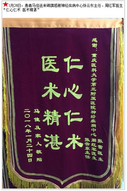 患者马佳送来锦旗感谢神经疾病中心张云东主任、周红军医生-锦旗-患者心声-患者服务-重庆医科大学附属第三医院【官方网站】