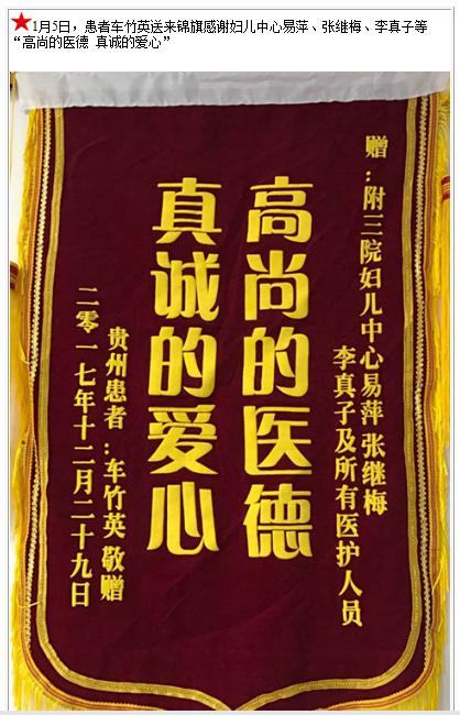患者车竹英送来锦旗感谢妇儿中心易萍、张继梅、李真子-锦旗-患者心声-患者服务-重庆医科大学附属第三医院【官方网站】