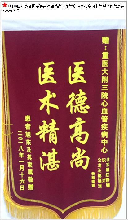 患者旭东送来锦旗感谢心血管疾病中心仝识非教授-锦旗-患者心声-患者服务-重庆医科大学附属第三医院【官方网站】