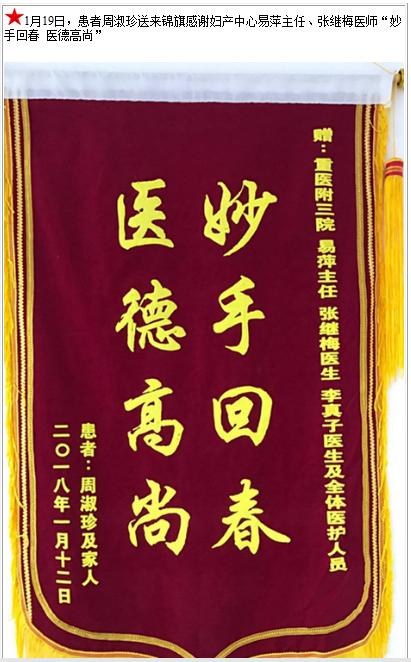 患者周淑珍送来锦旗感谢妇产中心易萍主任、张继梅医师-锦旗-患者心声-患者服务-重庆医科大学附属第三医院【官方网站】