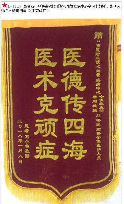 患者石小林送来锦旗感谢心血管疾病中心仝识非教授、唐刚医师-锦旗-患者心声-患者服务-重庆医科大学附属第三医院【官方网站】