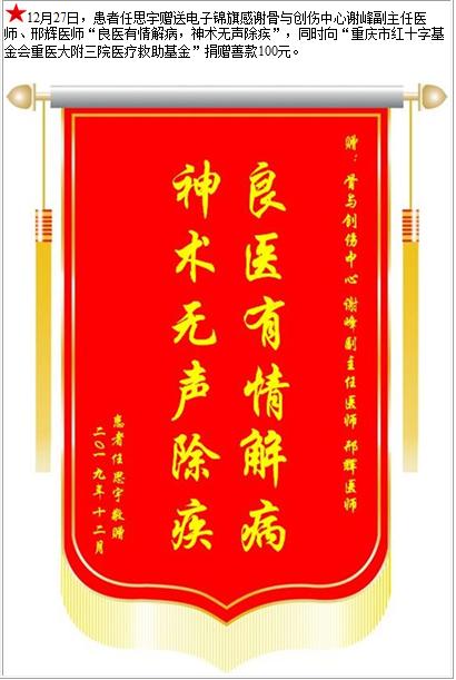 患者任思宇赠送电子锦旗感谢骨与创伤中心谢峰副主任医师等人,并向医疗救助基金捐赠善款100元-锦旗-患者心声-患者服务-重庆医科大学附属第三医院【官方网站】