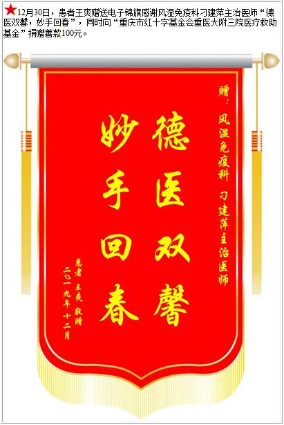 患者王爽赠送电子锦旗感谢风湿免疫科刁建萍主治医师,并向医疗救助基金捐赠善款100元-锦旗-患者心声-患者服务-重庆医科大学附属第三医院【官方网站】