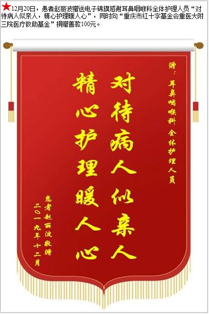 患者赵丽波赠送电子锦旗感谢耳鼻咽喉科全体护理人员,并向医疗救助基金捐赠善款100元-锦旗-患者心声-患者服务-重庆医科大学附属第三医院【官方网站】