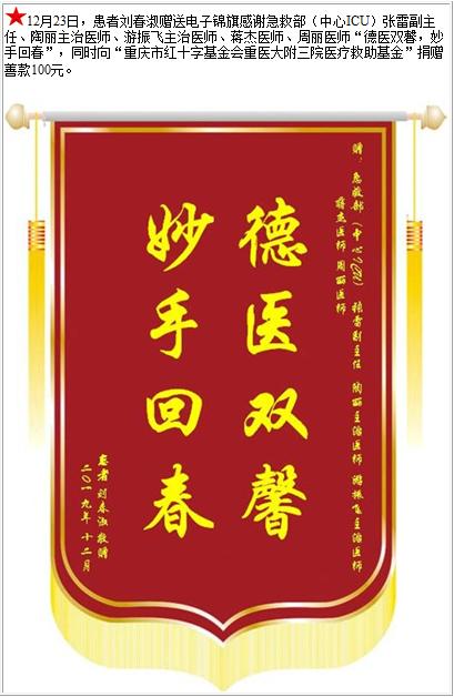 患者刘春淑赠送电子锦旗感谢急救部(中心ICU)张雷副主任等人,并向医疗救助基金捐赠善款100元-锦旗-患者心声-患者服务-重庆医科大学附属第三医院【官方网站】