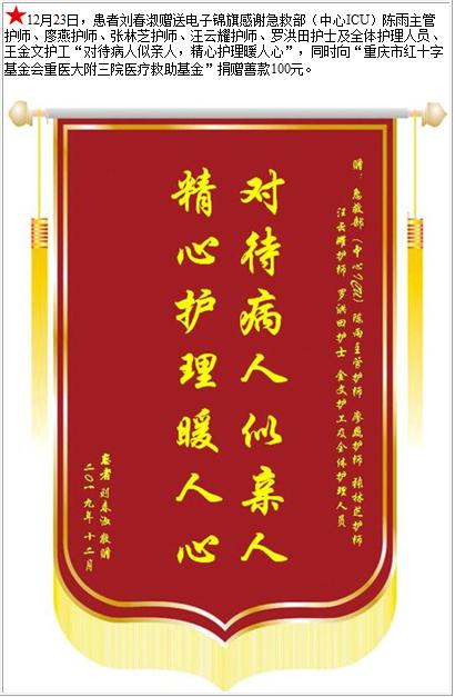 患者刘春淑赠送电子锦旗感谢急救部(中心ICU)陈雨主管护师等人,并向医疗救助基金捐赠善款100元-锦旗-患者心声-患者服务-重庆医科大学附属第三医院【官方网站】